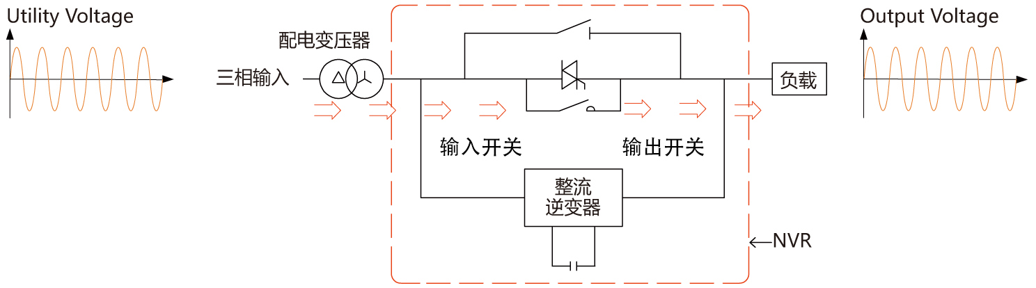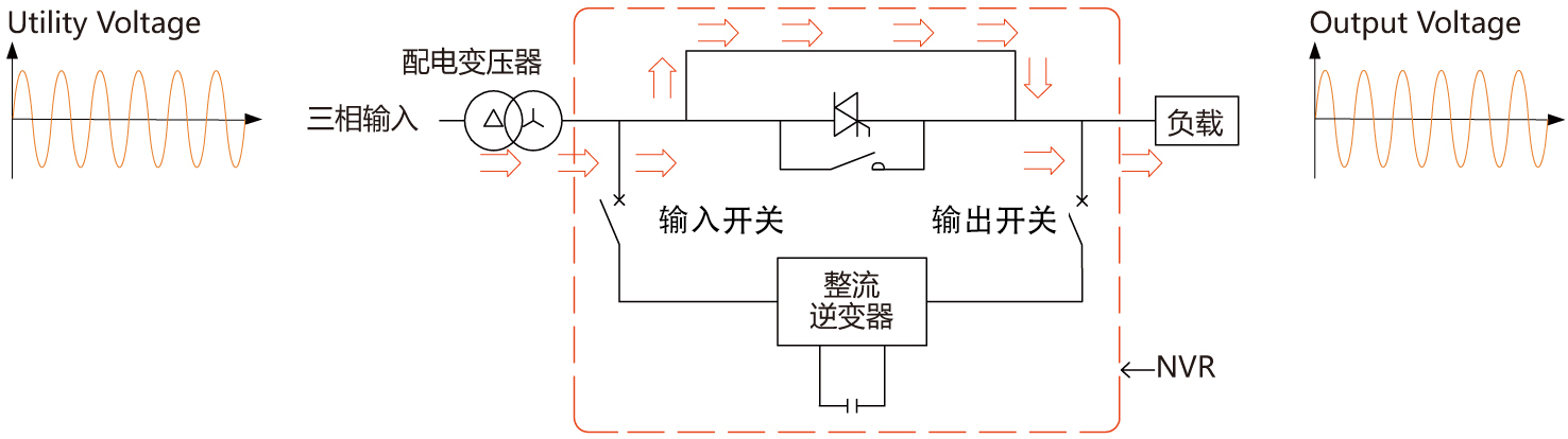 ? ?NVR故障或維護的情況下,負載電流將自動轉(zhuǎn)移到故障安全旁路。即電流將通過并聯(lián)于雙反接晶閘管的接觸器或旁路開關(guān),直接向負載供電。