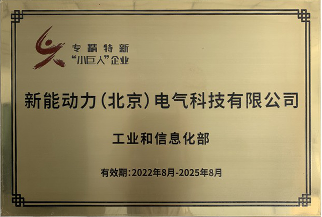 新能動力繼2020年10月入選“專精特新”中小企業,2022年2月進階北京市專精特新“小巨人”企業后,于2022年8月再次進階國家級專精特新“小巨人”。